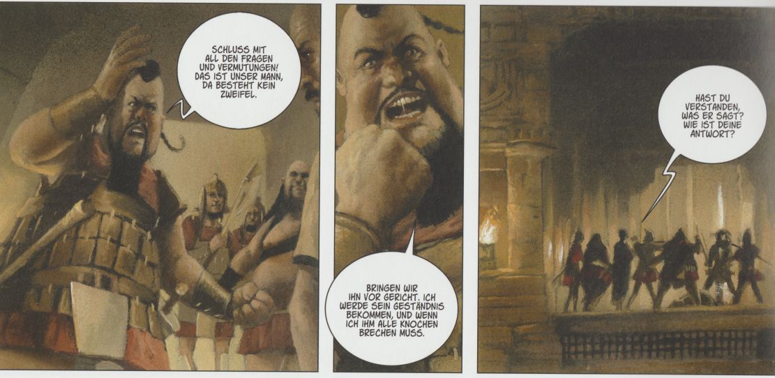 • Sein Auftraggeber, der ihn auf Diebestour schickt, verleugnet ihn und schüttelt den Barbar verächtlich von sich ab: „Ich kenne ihn nicht. Er ist verrückt zu behaupten, ich hätte ihn angestiftet. Soll er seine gerechte Strafe bekommen. Er hat ein breites Kreuz, und die Arbeit in den Minen wird ihm guttun.“