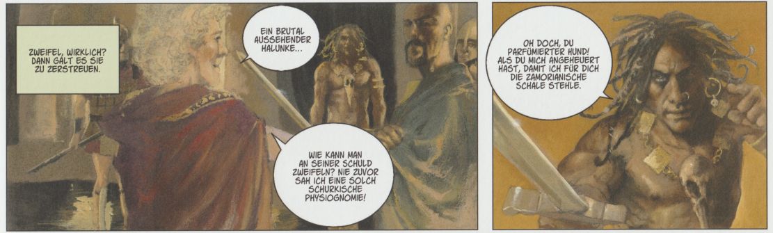 Der integre Barbar und sein verkommener Auftraggeber (der parfümierte Hund), ein Vertreter der sogenannten „Zivilisation“. Auch hier das letzte Bild bevor die Gewalt beginnt. Aus „Conan der Cimmerier“, Splitter 2021.