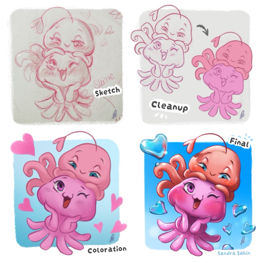 Ich skizziere meine Ideen zuerst, manchmal analog oder digital. Dann überlege ich, was ich darstellen möchte, was passt am besten zum Thema etc. und entscheide mich dann für einen Favoriten, der umgesetzt wird. Für das finale Motiv habe ich digital mit Procreate gearbeitet und die Outlines nochmal sauber nachgezeichnet, bevor ich dann mit der Farbe angefangen habe. Diesmal hatte ich Lust auf etwas Klares und Simples, das einfach Spaß machen sollte und dem Betrachter so eine „Verliebtheit“ oder Zuneigung vermittelt, die zwischen den beiden Figuren entsteht.