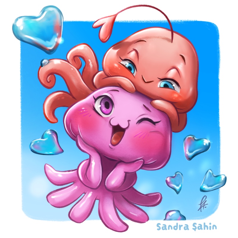 Ich freue mich jedes Jahr wieder darauf, ein Motiv für den Kalender zu zeichnen. Es macht Spaß da man nie wirklich weiß, welche Kalenderwoche man bekommen wird. Klar ist für mich, es wird irgendwas mit Oktopussen, das hat sich fast zu einer kleinen Tradition entwickelt. Es braucht für mich zwar keinen festen Tag um die Liebe zu feiern, aber Valentinstag fällt in meine Woche und so kam eins zum anderen – Herzchen und zwei verliebte Oktopusse – ich wollte mit meinem Motiv ein paar Herzen an alle verteilen.