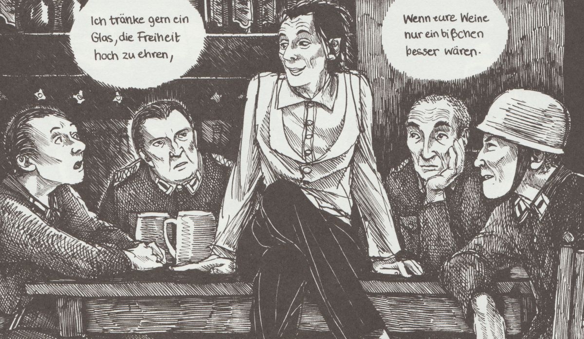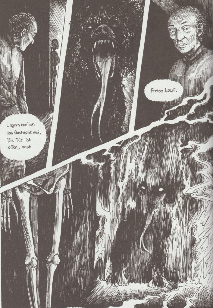 Die Visualisierung des Unheimlichen beherrscht Nele Heaslip. Eindrucksvoll ist die Szene, als Faust dem Pudel begegnet, diesen mit nach Hause nimmt und somit den Teufel ins Haus holt. Sie breitet allein diese Szene auf weit über 50 Seiten aus, es ist eine Darstellung, die ihresgleichen sucht. Die Dunkelheit der Nacht, das Spannungsfeld zwischen christlichen und magischen Symbolen, der Einbruch des dämonischen Elements in Faustens grüblerische Welt, die Auflösung der Panelstrukturen – es ist kraftvoller, als ich zu hoffen gewagt hatte und ein Triumph der Form. Dergleichen Höhepunkte hat der Comic einige zu bieten: Auerbachs Keller – diesmal feiern dort Wehrmachtsoldaten, nicht Studenten – ist ähnlich atmosphärisch und furios in Szene gesetzt, ebenso der Flug mit dem Mantel und der Ritt auf dem Fass. Nele Heaslip ist eine überzeugende Entsprechung dessen geglückt, was Friedrich Willhelm Murnau 1926 ähnlich visionär im Film aufzubieten hatte.