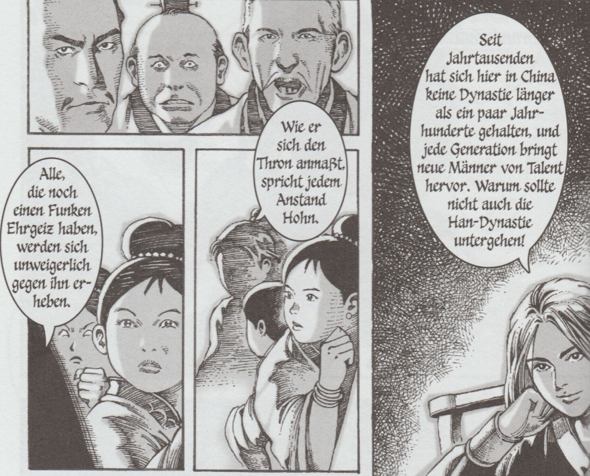 Vom Cover-Design lehnt sich Ravages of Time deutlich an Chinabooks Die Klingen der Wächter an. Sowohl thematisch als auch in Tonalität sind sich die beiden Titel nahe: Es geht um das ewige Wetteifern der Dynastien um die Vorherrschaft in China – ein Komplex, der so ausufernd ist, dass ich als ergänzende Lektüre gleich noch die ersten beiden Bände von Jing Lius Chinas Geschichte im Comic parallel dazu lesen wollte. Das schaffte über einige Aspekte der Story zusätzliche Klarheit. Während ich mich nach der Erstlektüre von Ravages of Time fühlte, als hätte mich ein Bus angefahren, konnte ich mich bei der Zweitsichtung weit besser auf die nicht unerhebliche Spannung des Buchs einlassen. Es hat einen Mehrwert, über die dynastischen Zyklen der chinesischen Geschichte zumindest rudimentäres Hintergrundwissen zu haben. Ebenso schadet es nicht, die widerstreitenden Philosophien, auf die sich chinesische Herrschaft gerne bezieht, zu kennen.