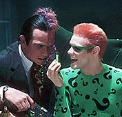Nachdem Tim Burton zwei wunderbar düstere Batman-Filme geschaffen hat, tritt nun Joel Schumacher an und sorgt mit seinen knalligen Farben eher für einen bunten Superhelden-Zirkus. Der Film wirkt sowieso eher wie ein weiterer Teil in die Reihe der Jim Carrey Grimassenfilme (á la "Ace Ventura" und "Der Dummschwätzer"), denn auf dessen Figur scheint hier das Hauptaugenmerkt des Regisseurs gelegen zu haben. Dazu gibt es dann noch Two-Face, den Tommy Lee Jones zum Einen sehr übertrieben spielt und der zum Anderen viele Leser der "Batman"-Comics aufregte, da er im Film seine Münze in einer Szene mehrfach wirft um das richtige Ergebnis zu bekommen, während er in den Comics nie das Ergebnis eines Münzwurfs in Frage stellt. Und natürlich gibt es in diesem Film wieder - wie in seinen beiden Vorgängern auch - eine Blondine in die sich Batman/Bruce Wayne verliebt und ihr seine Geheimidentität anvertraut. Das ist diesmal allerdings eine unsympathische Psychaterin mit Psychose. Dann ist da noch Robin, der hier zum ersten Mal auftaucht und eindeutig einige Jahre zu alt gecastet ist. Chris O'Donnell wäre wohl (wenn überhaupt) eine passende Besetzung für Nightwing, den inzwischen älteren ersten Robin. Und auch die neuen "Nippel-Kostüme" von Batman und Robin die Joel Schumacher in diesem Film vorstellt kamen sowohl bei den Fans, als auch bei "Batman"-Erfinder Bob Kane nicht sonderlich gut an. fs